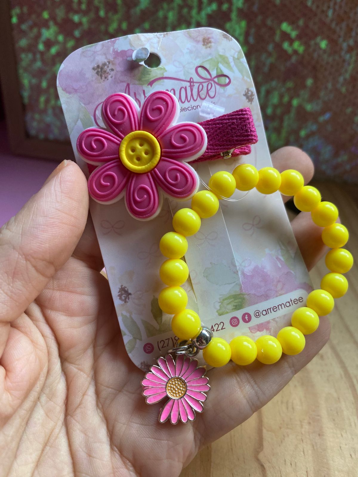 Kit com um Hair Clips e pulseiras combinando.