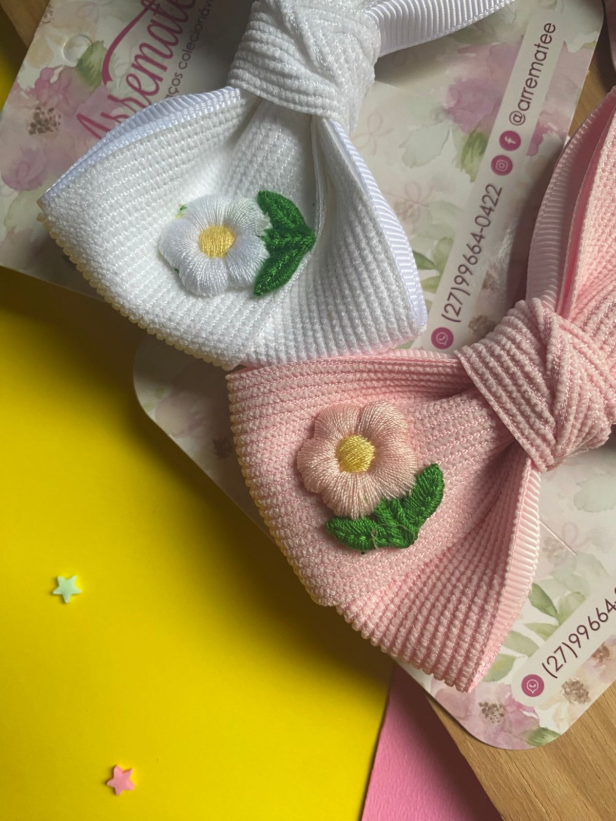 No tamanho M ou G, com flor aplicada e miolo torcido.